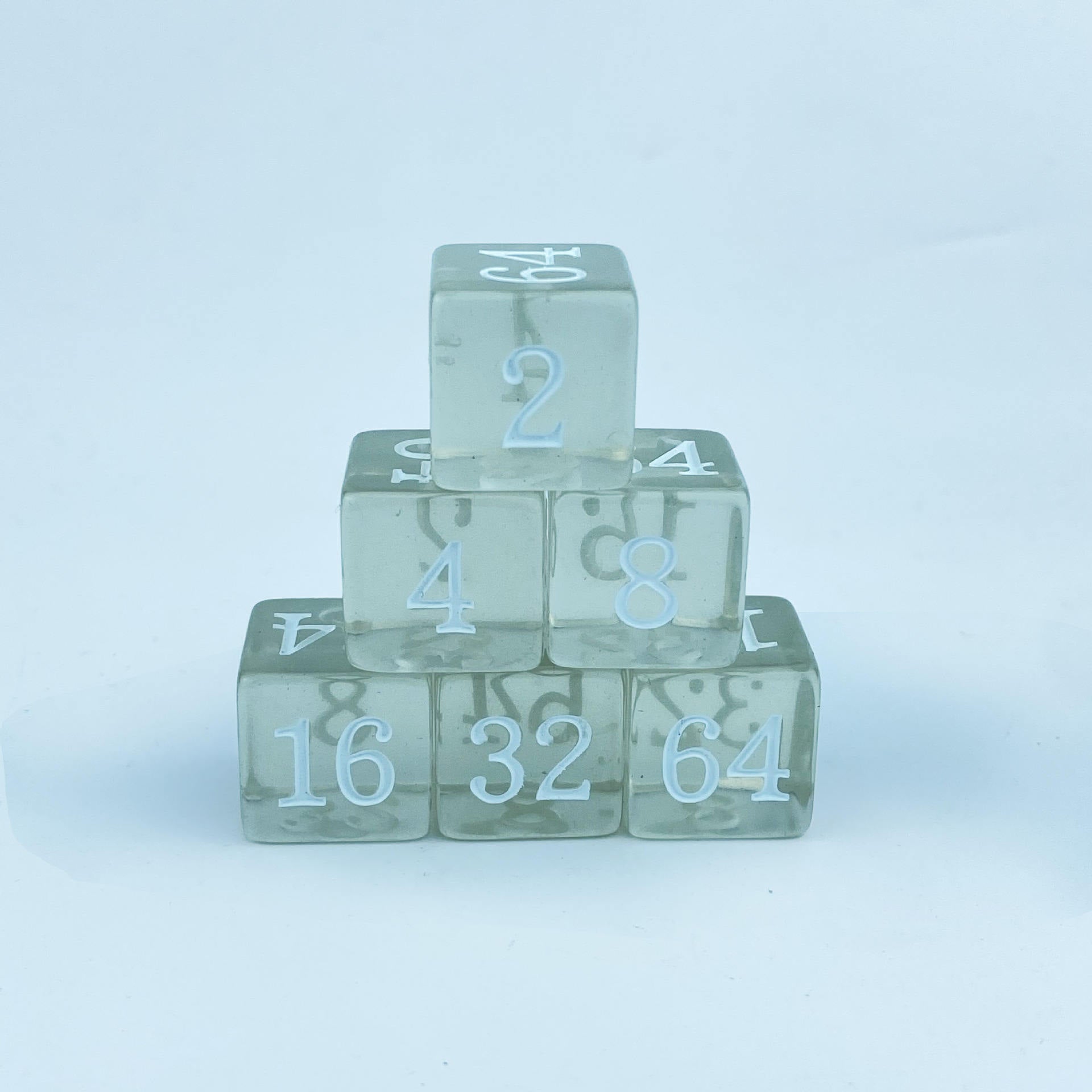 Acryl Würfel Set (6x) mit den Ziffern 2, 4, 8, 16, 32, 64 auf jedem Würfel.